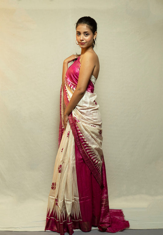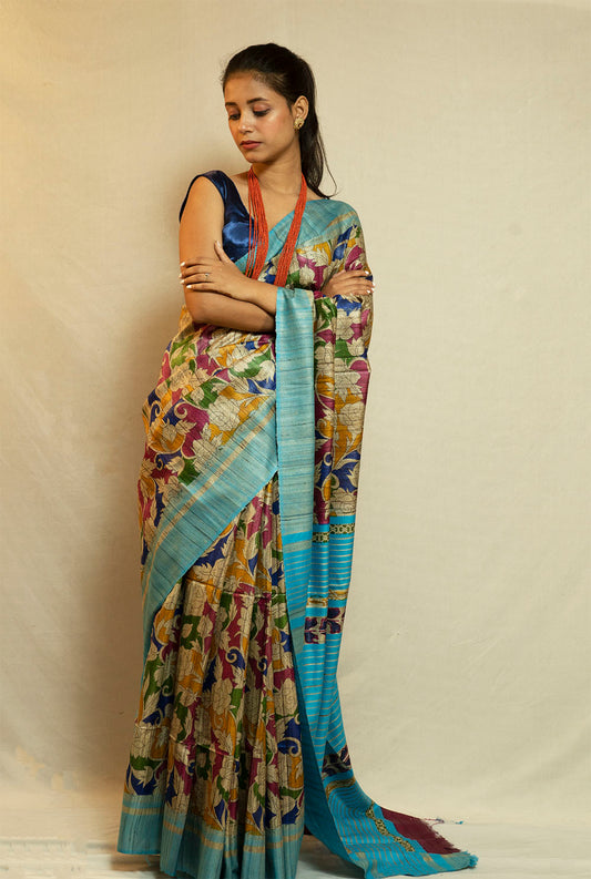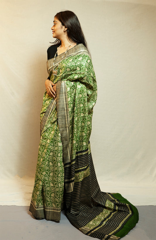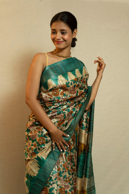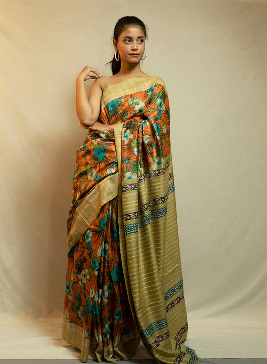 Printed Ghicha Saree (Pista Green and Orange Floral)