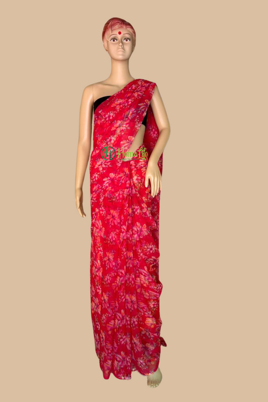 Vermilion red Floral Chiffon Saree