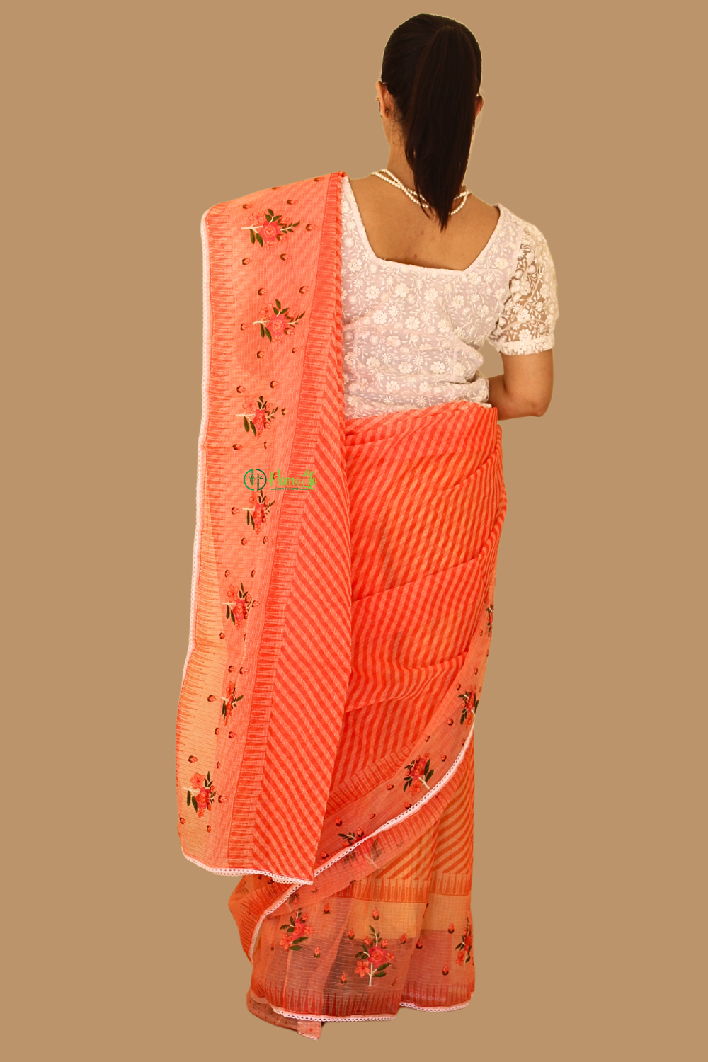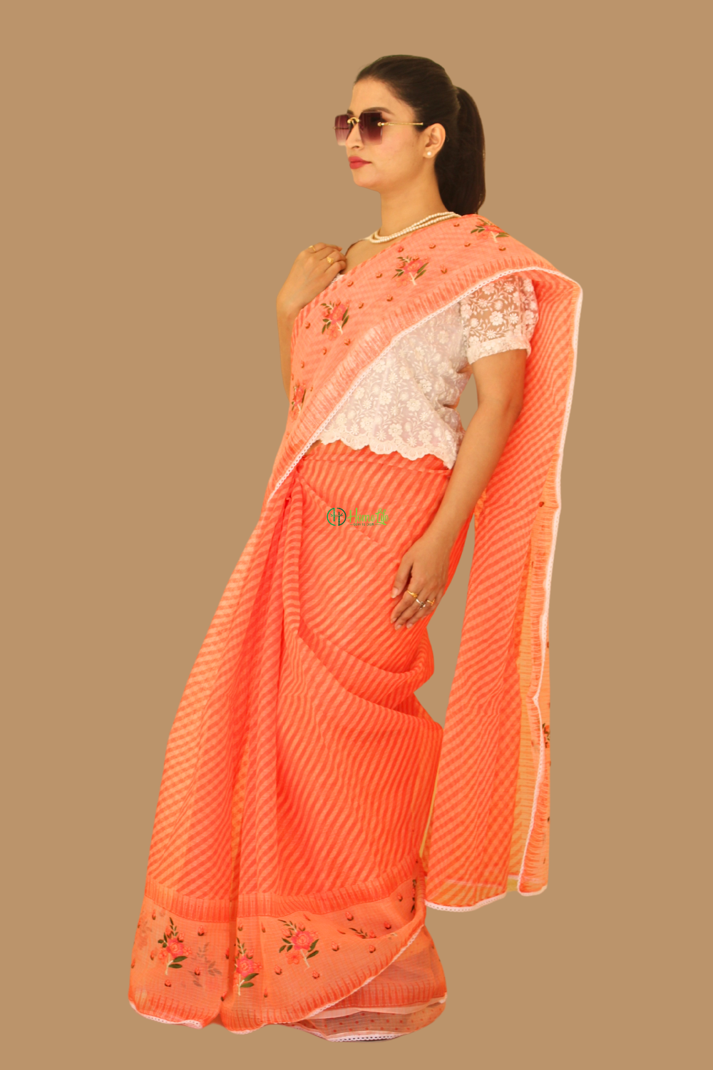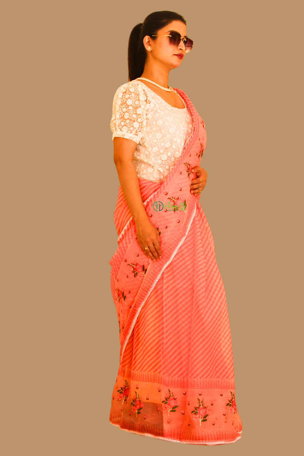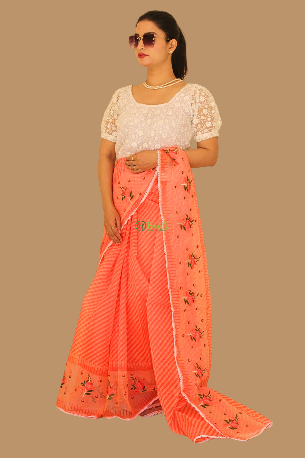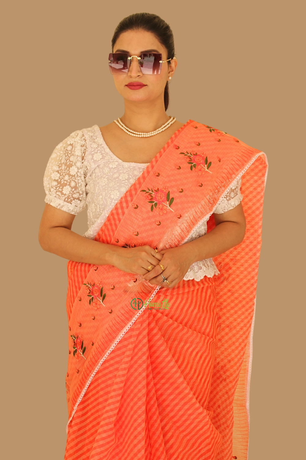 This Alka peach Kota Doria saree has full body embroidey work and heavy border as shown in the images. Summer friendly,decent colour and best for office/day wear.